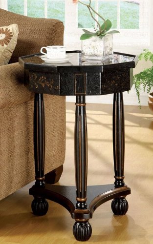 The Antique Cherry End Table from Coaster 900940 has an antiqued finish with a detailed inlaytop and gold accents. This end table is usually in stock and ships at no additional charge.Features:Antique finishDetailed inlay topGold accentsDimensions: (Coaster Model 900940) 19-1/4dia. x 28"h"
