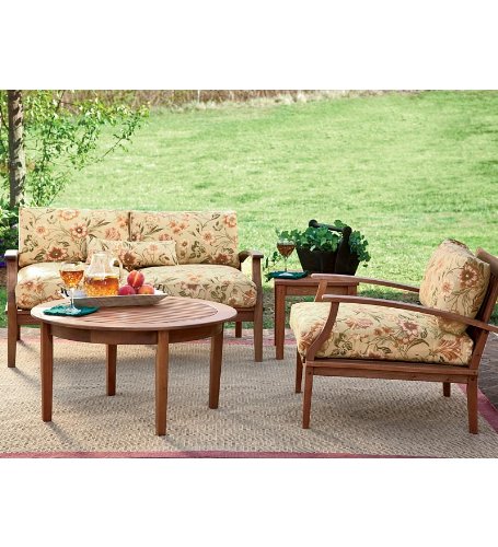 We created this Plow & Hearth Original to offer you true deep-seating comfort. The Chair and Love Seat are generously sized, with 4"-thick seat and back cushions you can really sink into. Each piece is carefully crafted of solid eucalyptus, a low-maintenance, renewable hardwood. Some assembly required. Each piece is carefully crafted of solid Forest Stewardship Council-certified eucalyptus that is sustainably harvested and plantation-grown. A low-maintenance, renewable hardwood, eucalyptus is an ideal choice for outdoor furniture because of its extremely dense nature and resistance to rot and decay. The high oil content repels moisture and water and weathers to a soft gray over time. Some assembly required. 3-piece Outdoor Loveseat, Chair and End Table Set. Generously sized with 4" thick seat and back cushions. Low-maintenance and weather-resistant. Durable, sustainable hardwood. Some assembly required. Save on the Set! Set 34556 includes Love Seat, Chair and End Table. Available Colors: Antique Floral, Moss Stripe, Neutral, Textured Linen. Sizes: Sofa 78"L x 33-3/4"W x 28-3/4"H, Chair 29"L x 34"W x 28-3/4"H, Love Seat 53-1/2"L x 34"W x 28-3/4"H, Round Coffee Table 35-1/2"dia. x 18-1/2"H, Square Coffee Table 36"sq. x 18-1/2"H, End Table 18"sq. x 17"H, Ottoman with Cushion 24-1/2"sq. x 18"H, Lumbar Support Pillow 24" x 7-1/2" x 4 1/2". Shipping: #34556 Eucalyptus Love Seat, Chair and End Table Set ships Motor Freight. Allow 2-3 weeks for delivery.