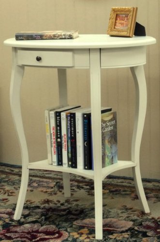 Clear the clutter and give your living room stylish detail with the Martha Oval End Table. It has a distinctive oval top with a drawer in the apron, and has a scalloped lower shelf. With all this storage space in a small package, this round wood table is the ideal solution to clutter. It will fit right in with your living room furniture and give it a classic touch. Comes in Antique Ivory. Assembly level/degree of difficulty: Easy.
